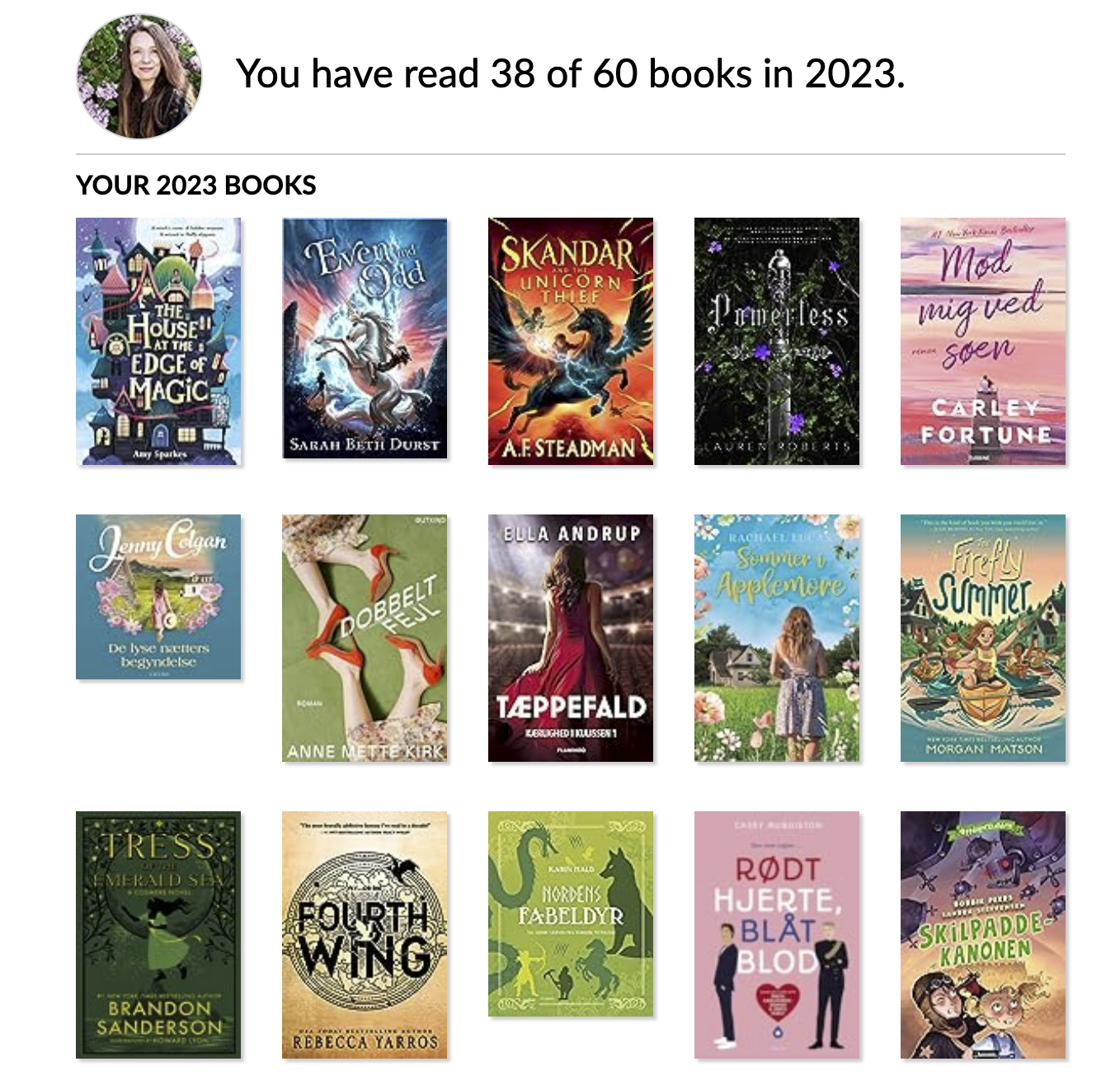 Jeg bruger altid Goodreads årslæsemål og omkring nytår sat jeg den til 40 bøger, velvidende at jeg nok helt sikkert ville sætte den op til 60, men jeg ville helst ikke sætte den til 60 fra starten af, for jeg ville gerne have fokus på at jeg også skulle skrive bøger.